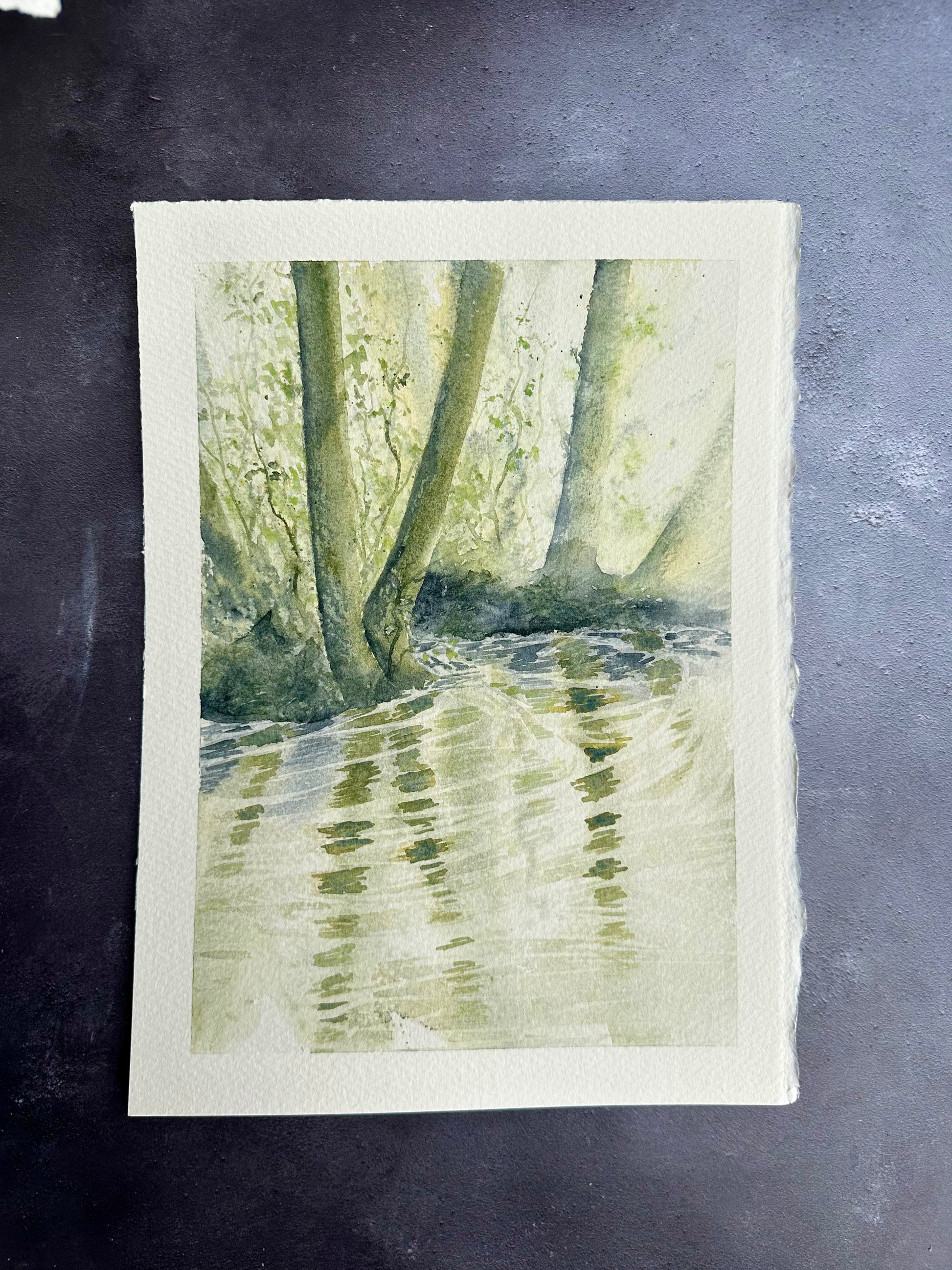 This stunning original watercolour captures the beauty of Ilkley's riverside, where an array of trees and shrubs line the water, creating stunning reflections and providing a paradise for tiny fish and children to play.