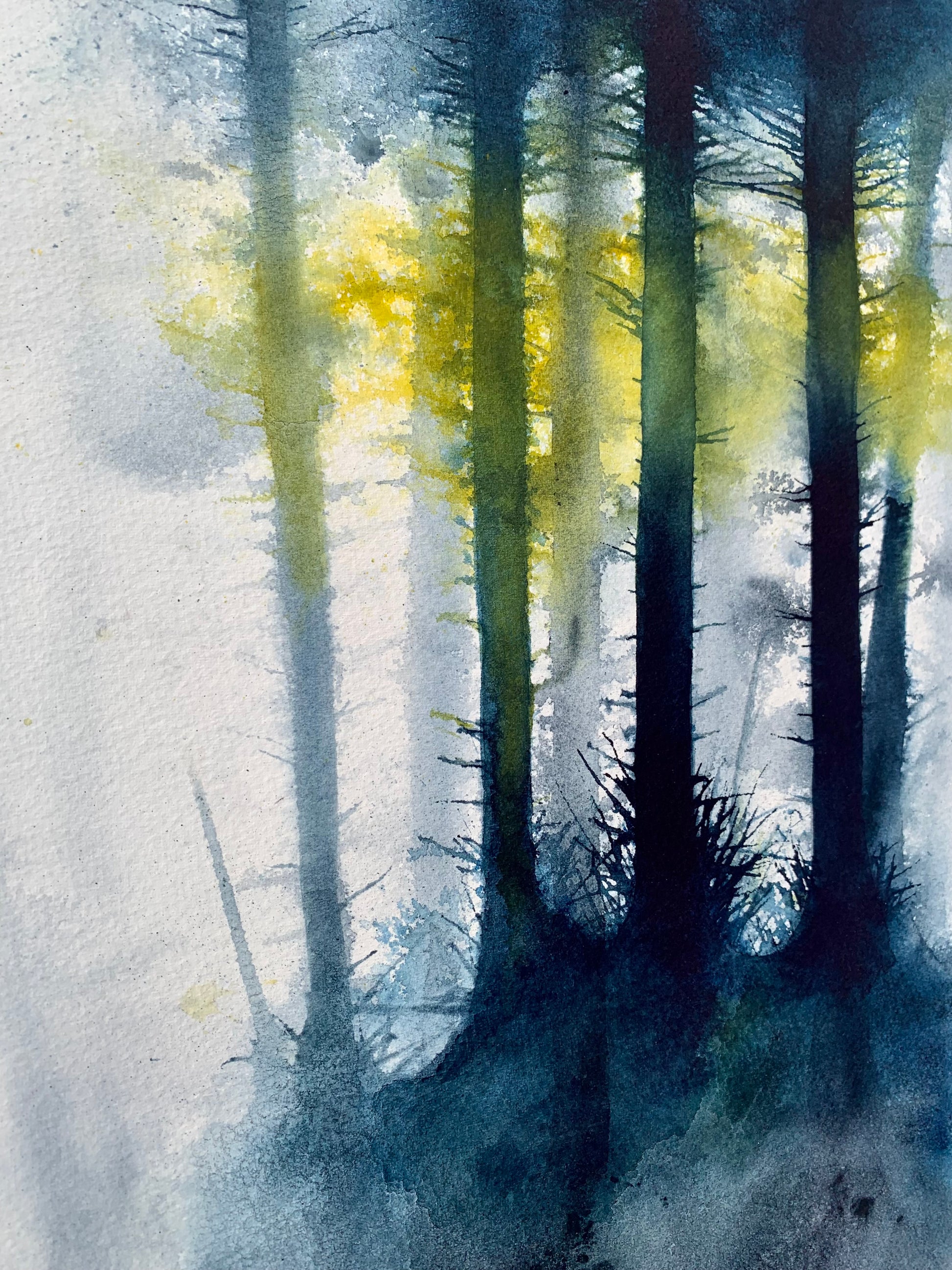Middleton woods in Ilkley are bordered by an area of pines among the beech and oaks. This large painting shows the sunshine sparkling through the pine trees.