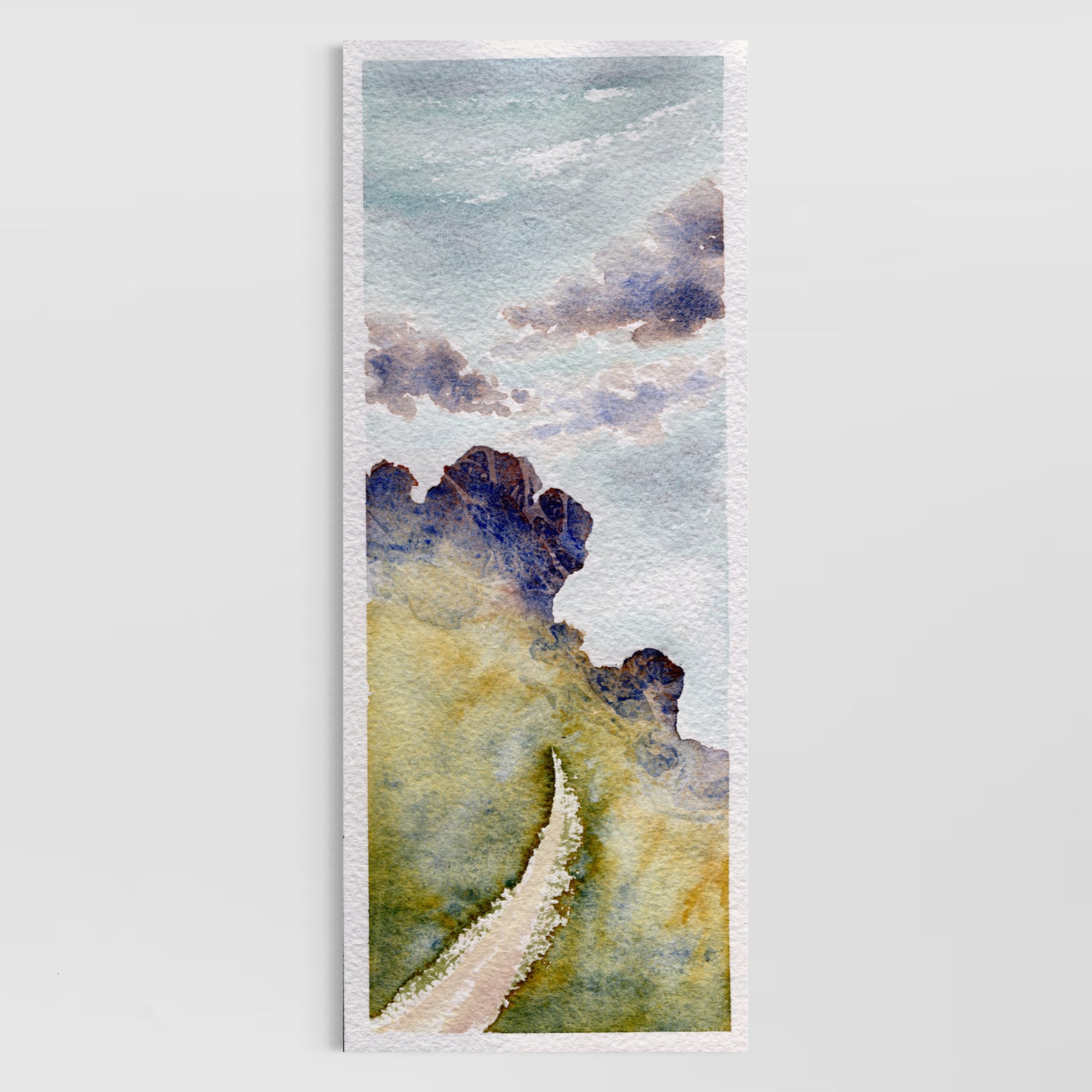 This watercolour painting artfully depicts the rocks of Cow and Calf on Ilkley Moor, as well as the foliage and walkway leading up to them.