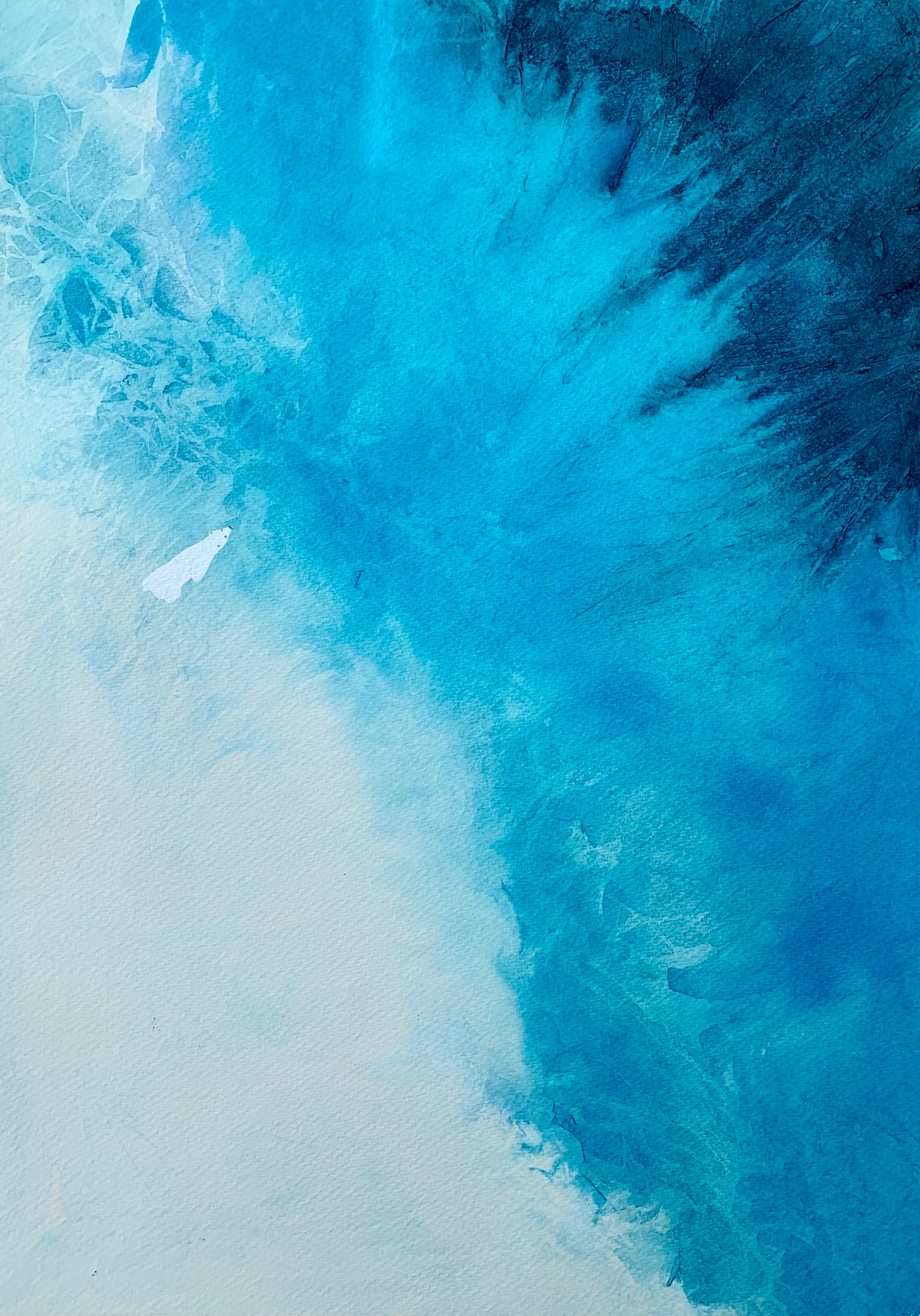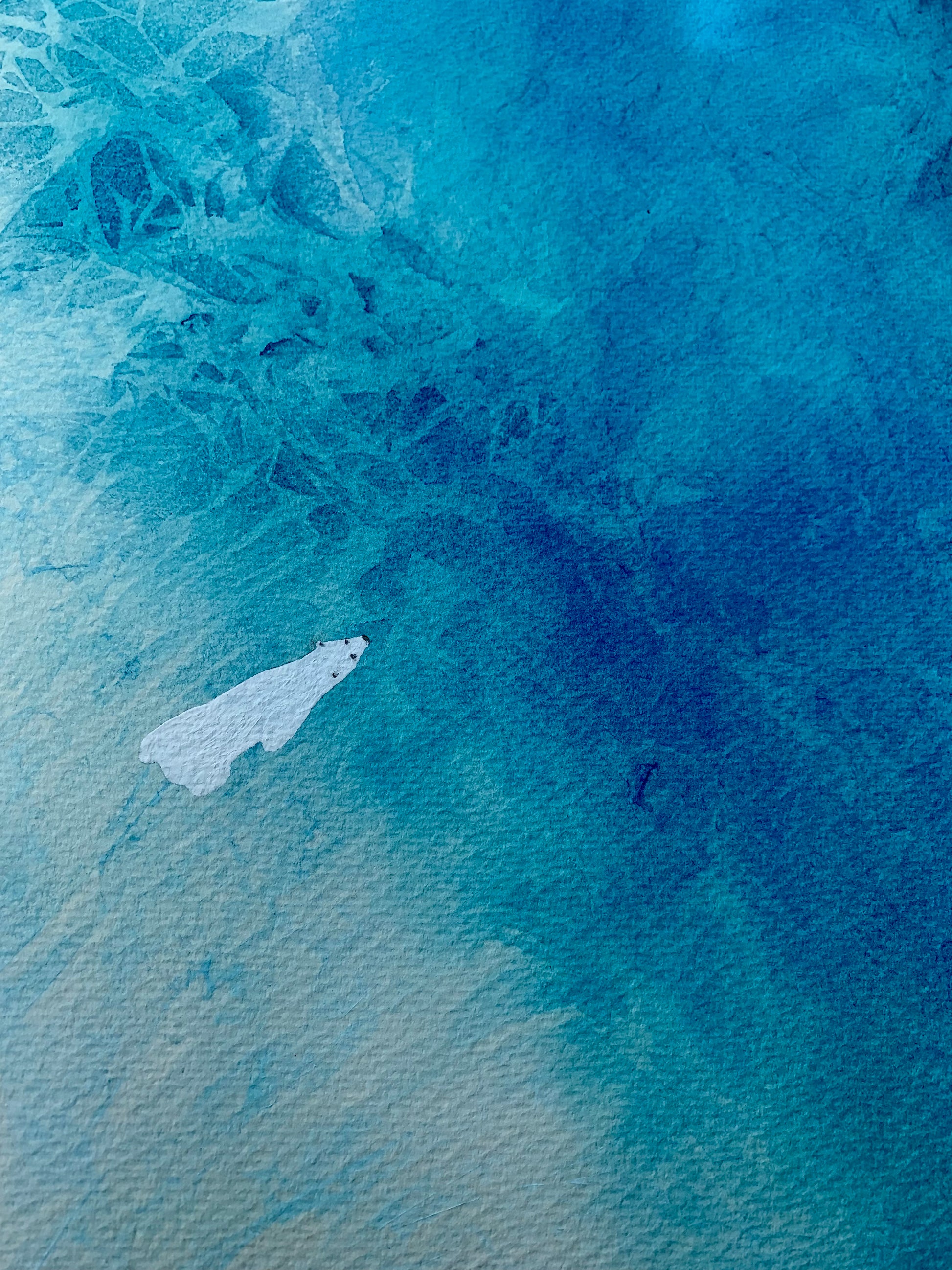 Due to climate change, substantial amounts of offshore sea ice are melting which means polar bears must swim farther out to sea in search of ice floes where they hunt. This large acrylic ink painting of a lonely polar bear staring out across the fractured ice floes was shortlisted for the Octopus Energy Climate Change Exhibition and displayed on electronic billboards across London last year.
