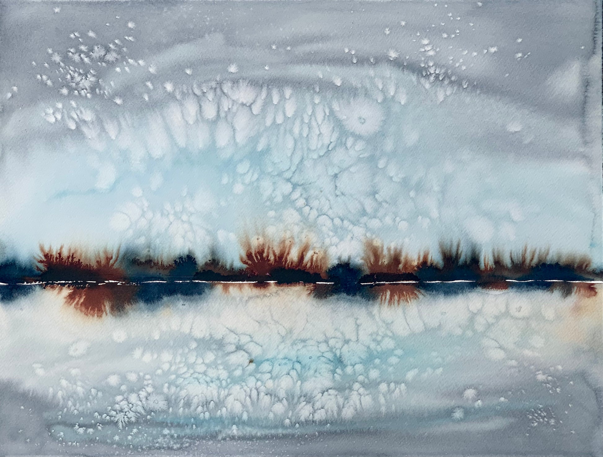 Last year we stayed in a boathouse right on the shores of Windermere in the Lake District. Every morning I woke up before the rest of the family and got to see the lake before a single boat or canoe had broken the surface of the water. In that moment the lake is perfectly still, and the reflections of the banks of the river in the still water are beautiful. This larger watercolour captures the still water, the morning mist and the woody banks of the river.
